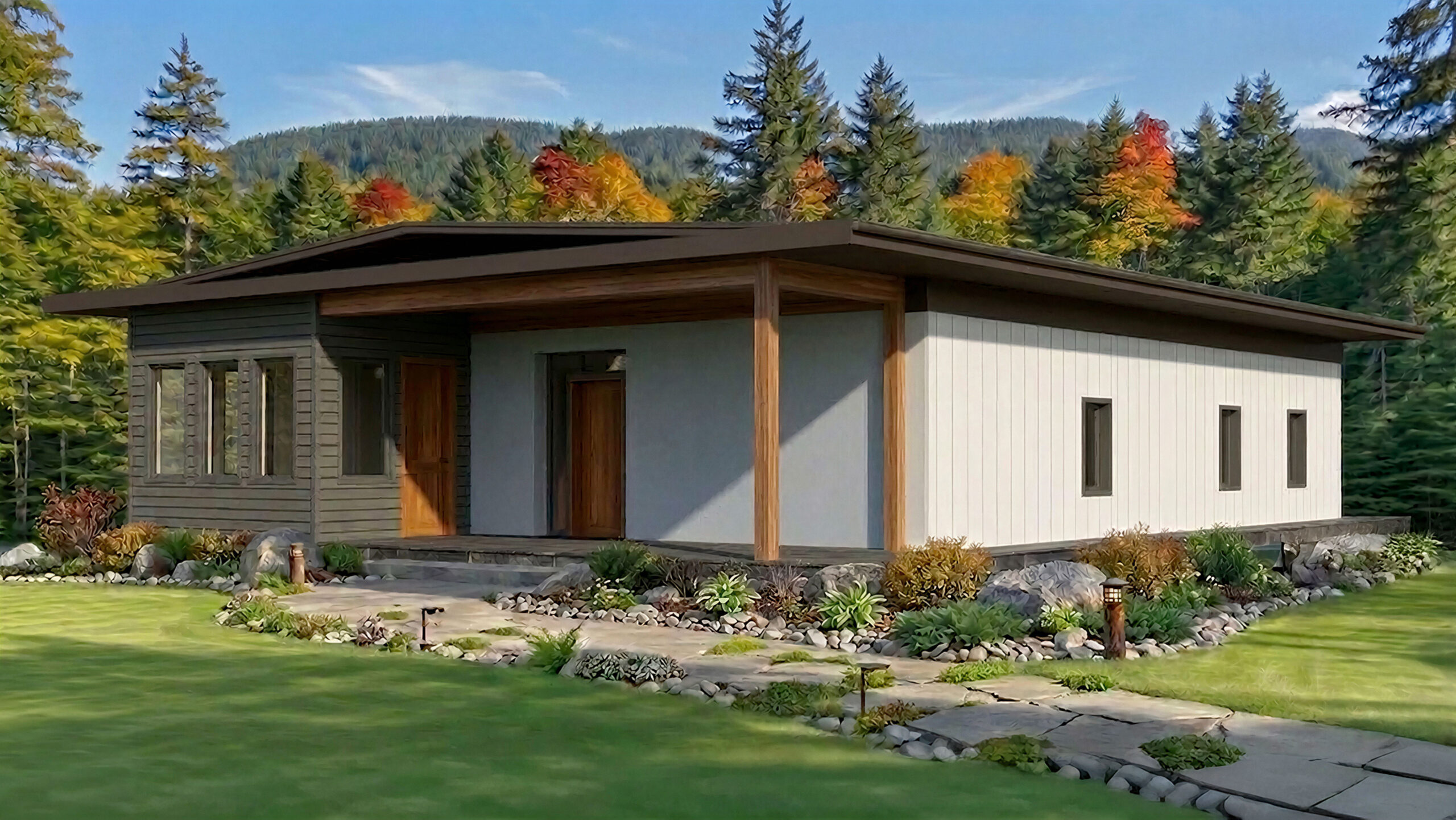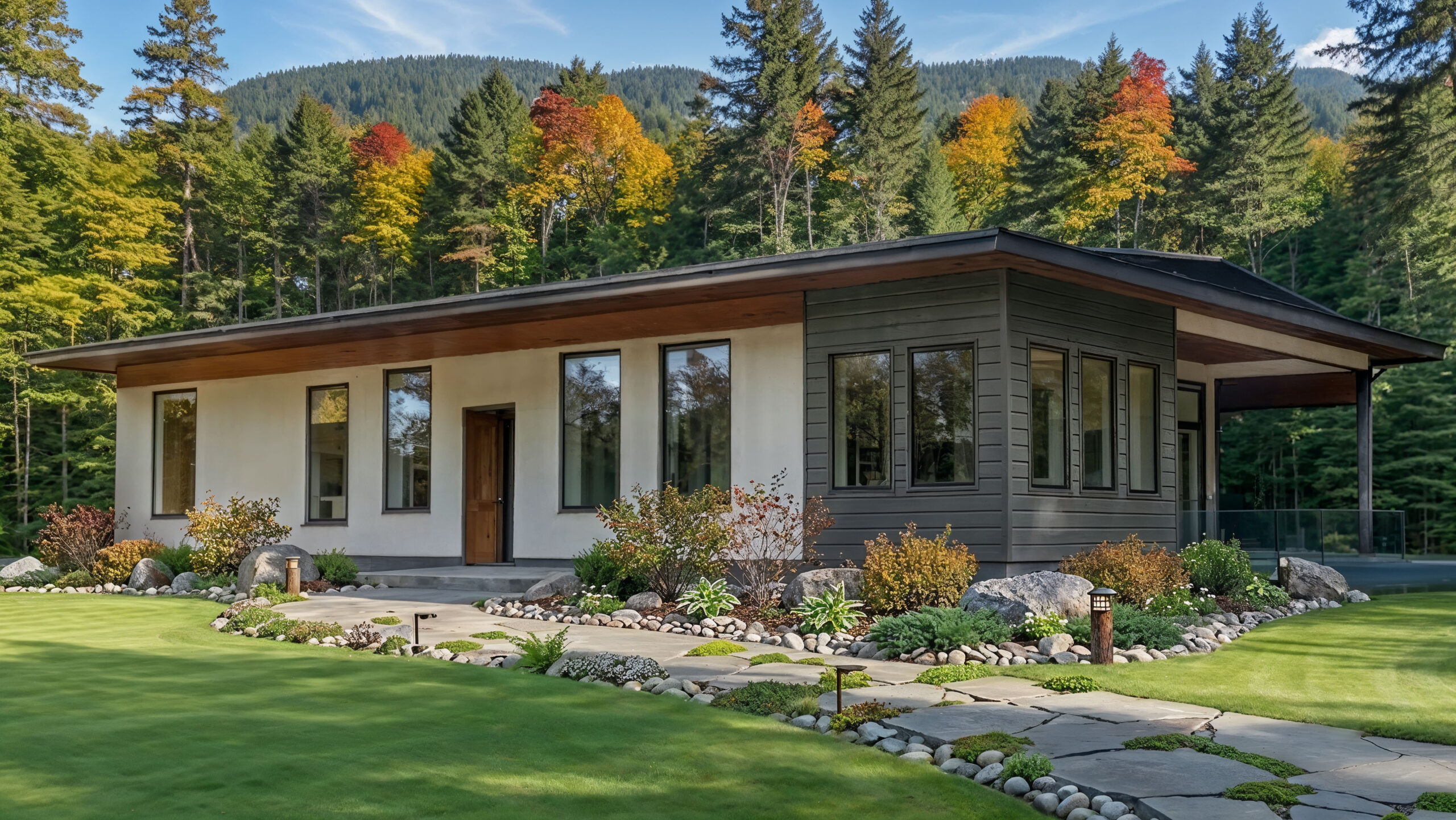 Expansive fixed windows flood the interiors with daylight and frame panoramic views, while the open-concept layout connects living, dining, and kitchen spaces for effortless entertaining.